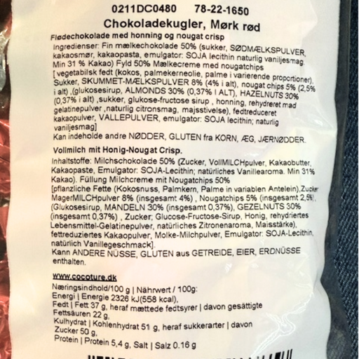 CocotureFyldt chokolade med honning og nougat crisp lavet på flødechokolade med 30,5% kakao Ca. 14 g pr. chokoladekugle.