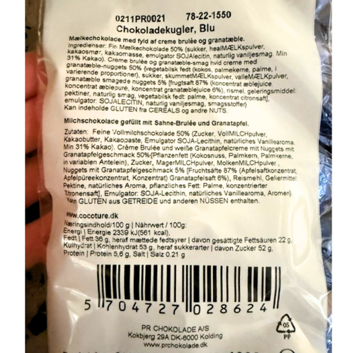 Se hele informationChokoladekugle | Mælkechokolade med creme brulée og granatæble - Mørkeblå