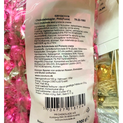 CocotureVirkelig lækker chokoladekugle fyldt med pistacie – indeholder mørk chokolade med 50% kakao. Ca. 14 g pr. chokoladekugle.