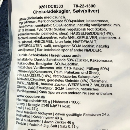 CocotureFyldt chokolade med crisp kerne – indeholder mørk chokolade a´ 50% kakao.Ca. 14 g pr. chokoladekugle.