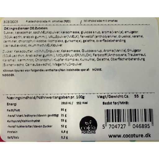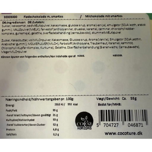 Cocoture55 gram luksus chokolade drysset med knasende sprøde smarties. Lækker chokolade til de små.