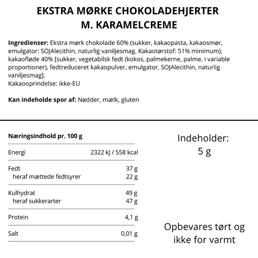 CocotureFyldt chokolade m/ karamel og havsalt – indeholder mørk chokolade med 50% kakao. Ca. 14 g pr. chokoladekugle.