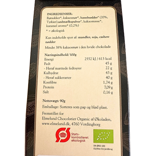Elmelund ChocolatierDansk økologisk chokoladeplade af den lækreste hvide chokolade fra Elmelund Chocolateri. Chokoladen bliver rørt sammen med karamel inden tempererin...