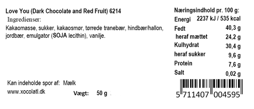 XocolatlLækker chokoladebar med 70 % mørk chokolade med røde bær. Chokoladebaren er i flot emballage, hvor der står 'Love you' på æsken. 50 g.