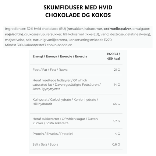 The MallowsØkologiske vanilje skumfiduser dragéret med belgisk hvid chokolade og sprøde kokosflager. En skøn smagskombination for dem, der elsker kokos. 90g ...