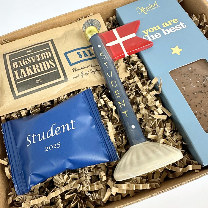 Gaven er speciallavet til studenten med et flag med teksten 'student' samt lidt lækkert lakrids og chokolade.